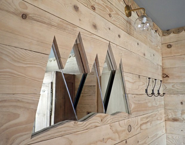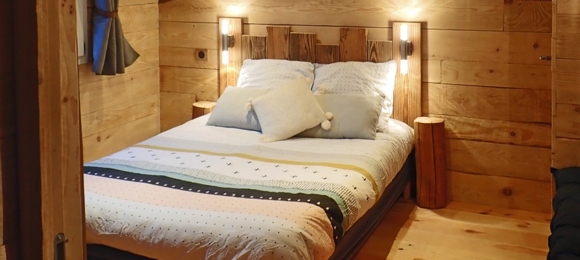 LA CABANE / La seconde chambre est le paradis des enfants : une véritable cabane traversée par un vrai tronc d’arbre ! Elle peut accueillir trois personnes grâce à un lit en 80 (couettes, oreiller 60 x 60) et un lit en 140 en mezzanine (couettes et oreillers en 60 x60) , une penderie et un coffre à jouets.