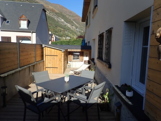 EXTERIEUR / Une grande terrasse de 25m2, orientée ouest nord ouest, ensoleillée l’après midi et le soir, permet de prendre les repas, ou profiter d’un bain de soleil. Vous y trouverez un grand cabanon privatif (fermé à clef) pour y ranger 3 ou 4 vélos, poussettes, skis etc. Nous vous mettons à disposition un pied d’atelier pour la mécanique de vos vélos.